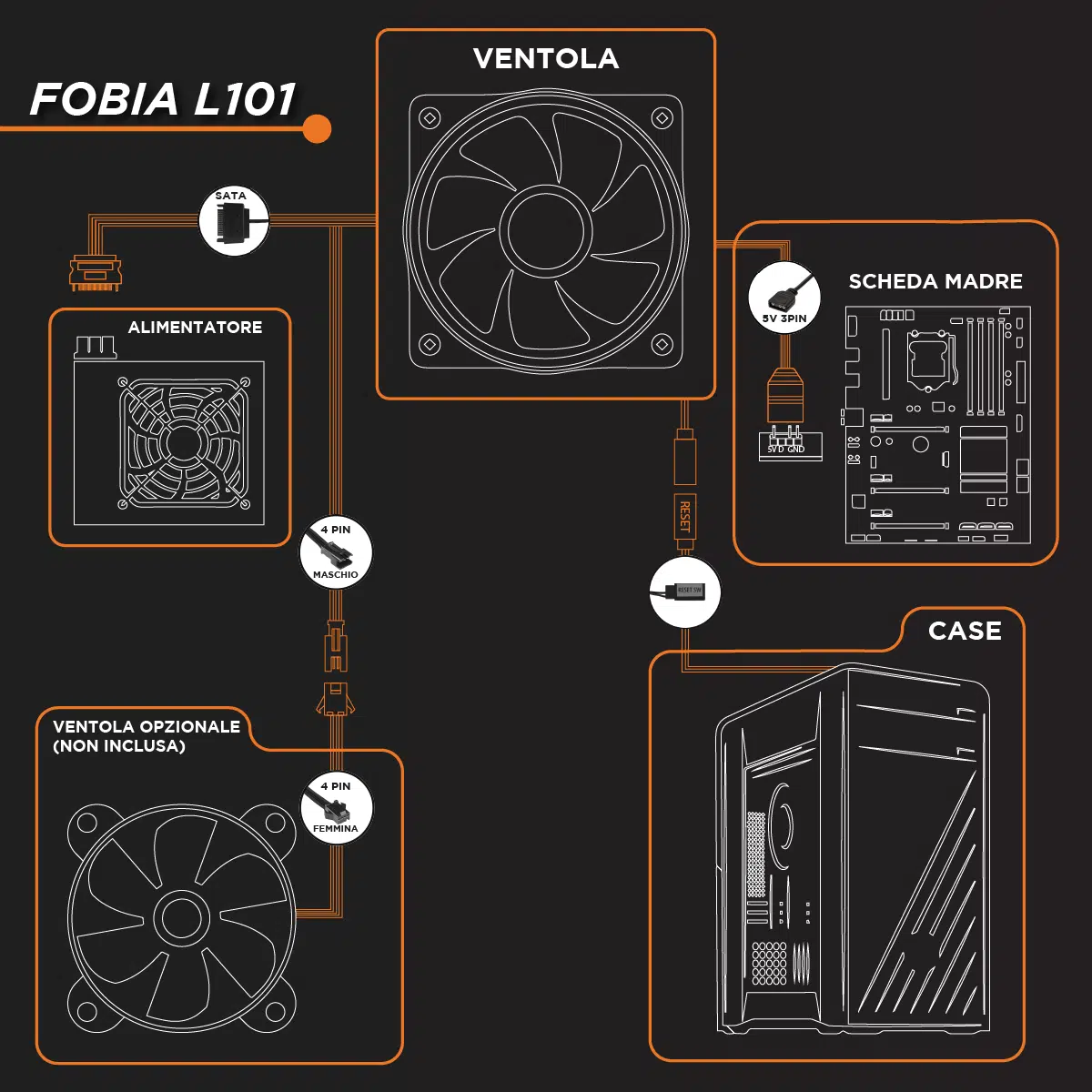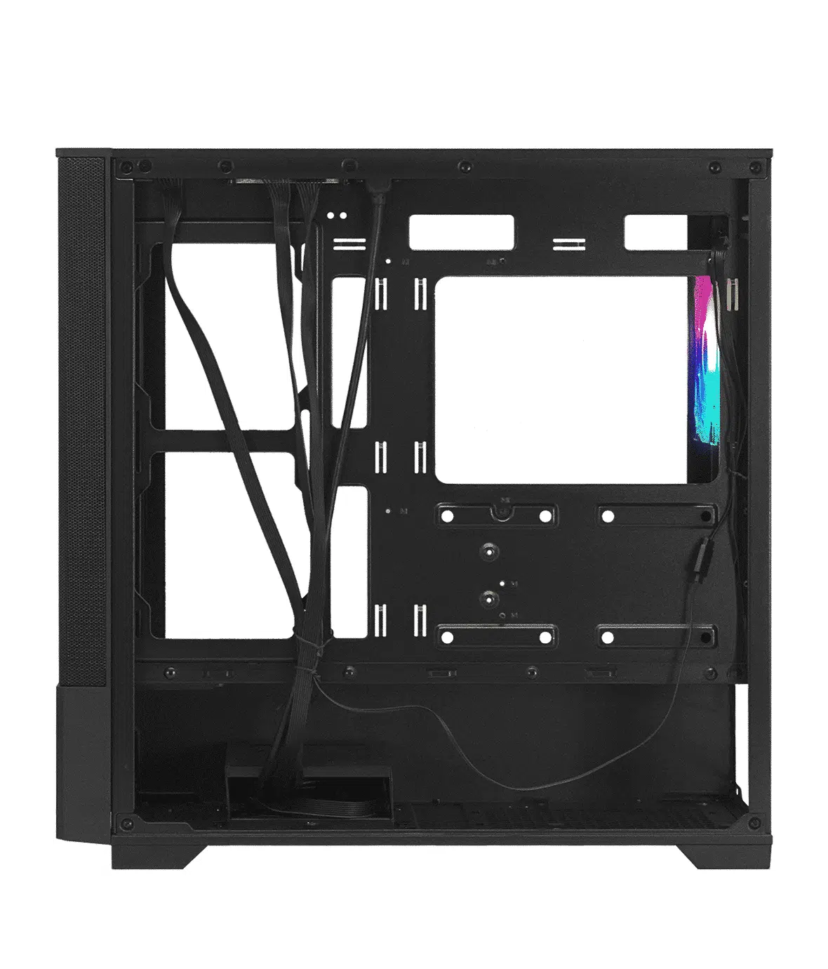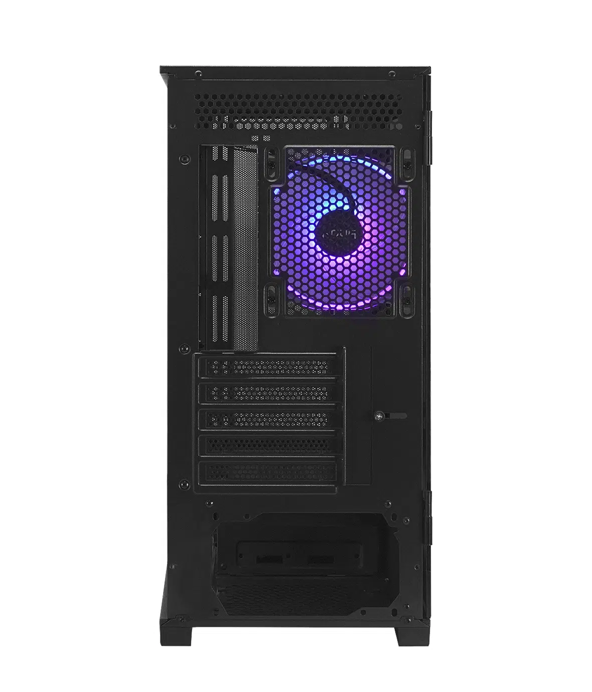 Preinstallata una ventola ARGB indirizzabile sul retro del case. Essa ha alimentazione Sata, connettore 2pin per tasto reset, connettore 3pin 5v per la sincronizzazione su schede madri, connettore 4pin per aggiungere altre ventole.