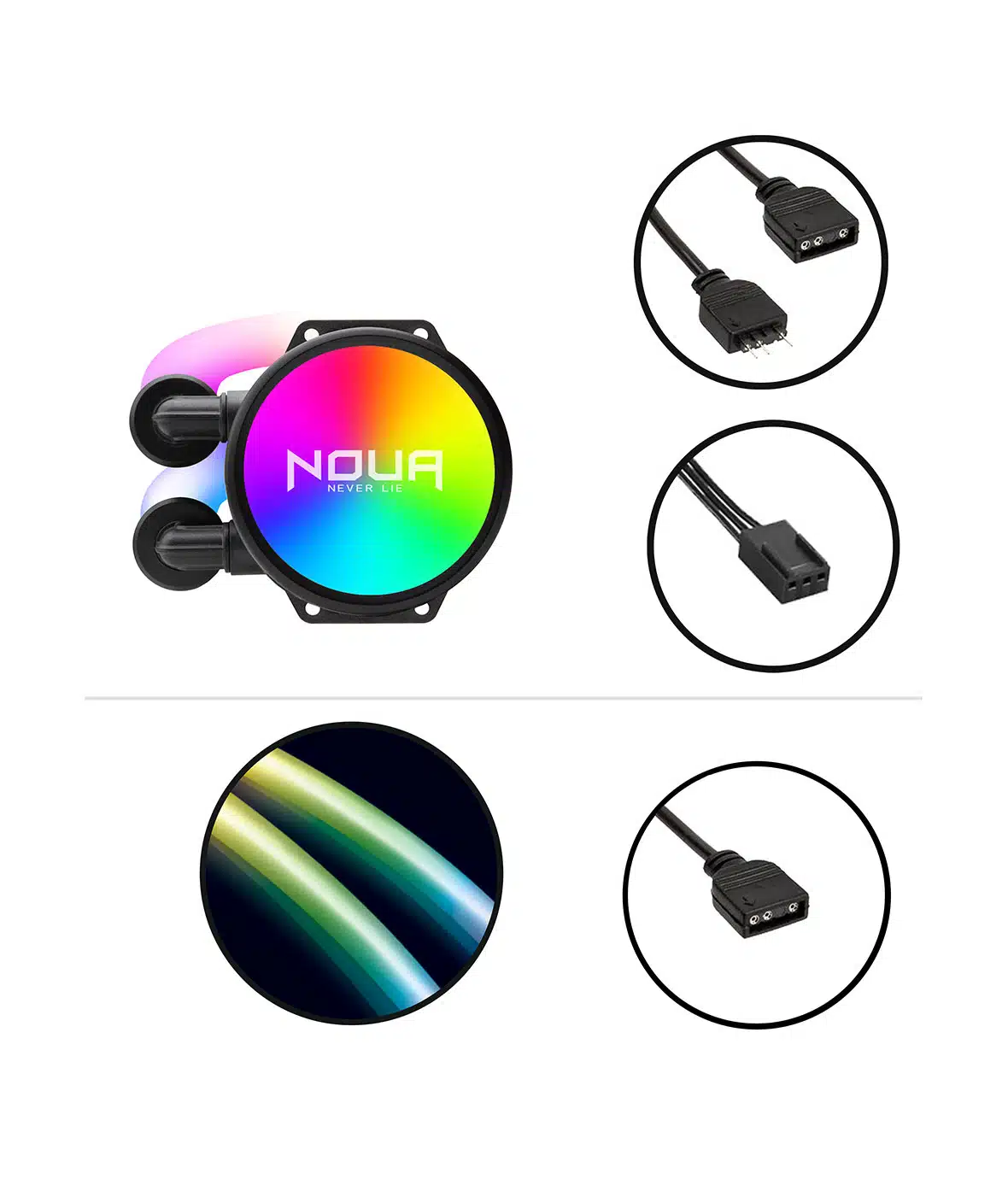 Il dissipatore Glacial è compatibile con Aura Sync (ASUS), Polychrome (ASROCK), Mystic Light (MSI), RGB Fusion (Gigabyte), per la sincronizzazione con la Scheda Madre tramite 5V.