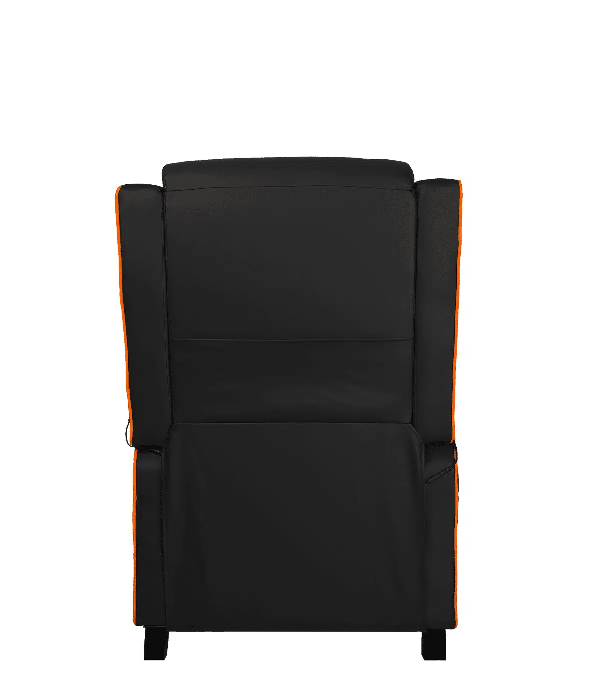 Design moderno ed accattivante con schienale reclinabile ergonomico, poggiatesta, cuscino lombare e poggiapiedi, completamente imbottiti di spugna e con logo e scritta di colore arancio.