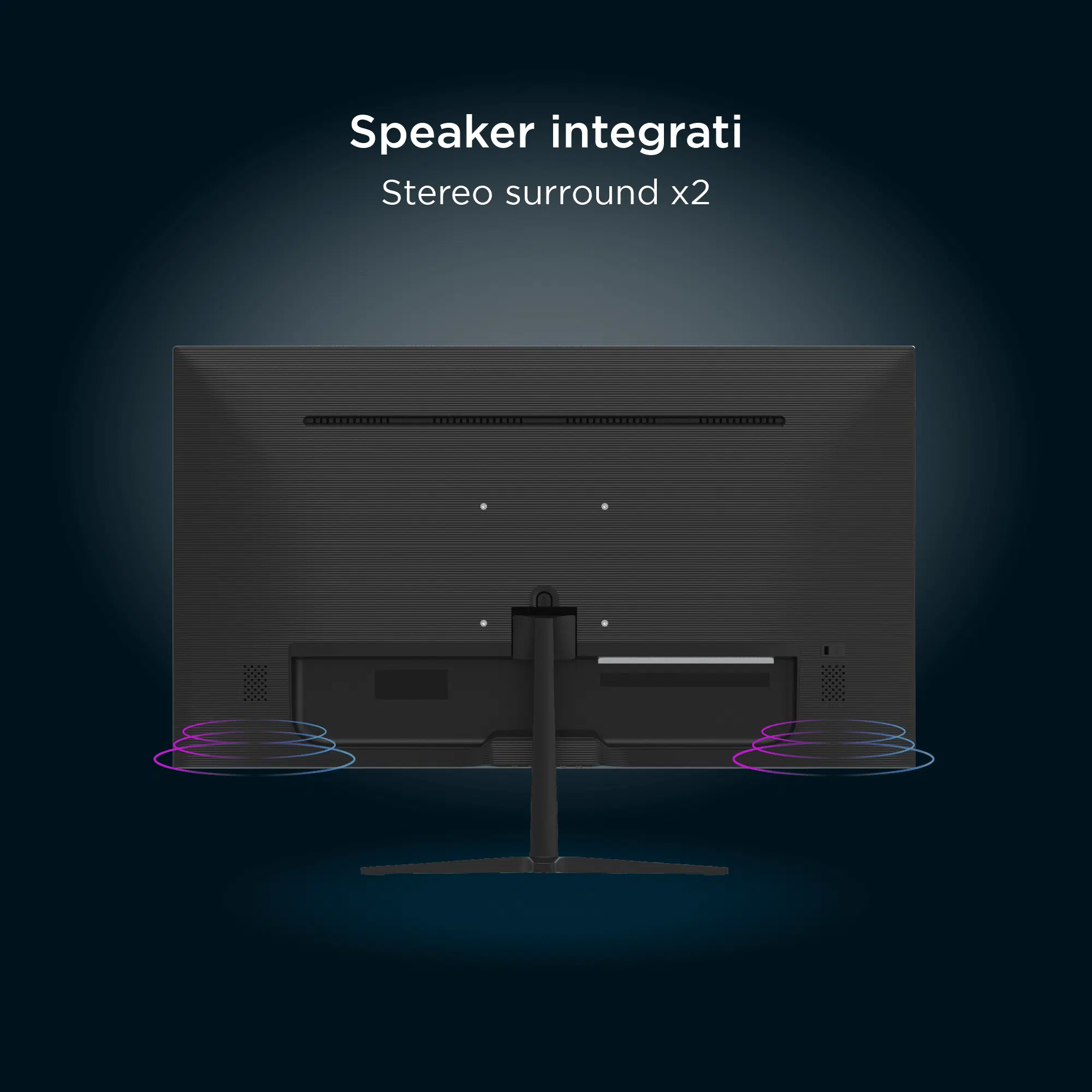 Dotato di connettori HDMI e VGA e di un’uscita audio, il monitor si integra perfettamente con tutti i dispositivi. All’interno della confezione vi è un cavo HDMI che lo rende immediatamente pronto all’uso. Inoltre, gli altoparlanti integrati forniscono un audio chiaro e comodo, eliminando la necessità di altoparlanti esterni e creando uno spazio di lavoro efficiente e ordinato.