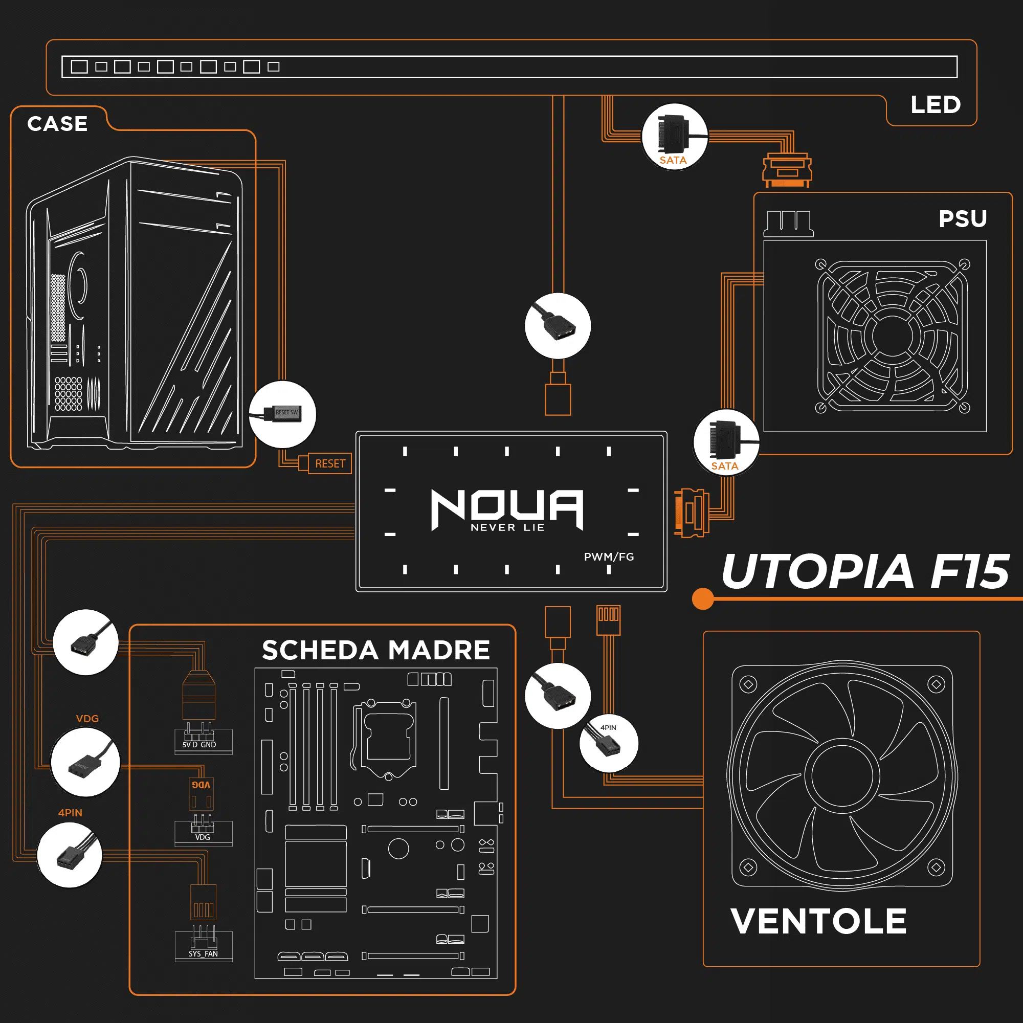 Pre-installata 1 ventola sincronizzabile RGB: (una retro). In Dotazione è presente controller che permette l’installazione fino a 6 ventole.