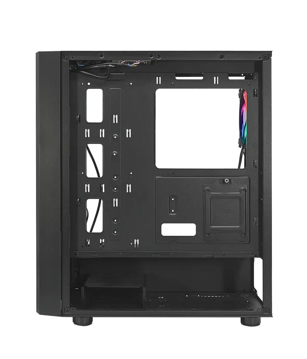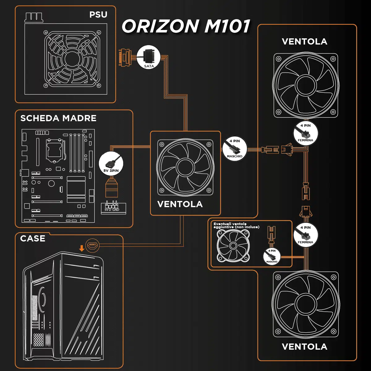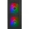 Preinstallate tre ventole ARGB indirizzabili (due da 200mm sul frontale, una da 120mm sul retro). La ventola posteriore, che funge da ventola principale, è dotata di alimentazione Sata, connettore 2pin per tasto reset, connettore 3pin 5v per la sincronizzazione su schede madri, connettore 4pin per aggiungere altre ventole; mentre le due ventole frontali sono dotate di connettore 4pin da collegare alle ventola posteriore.