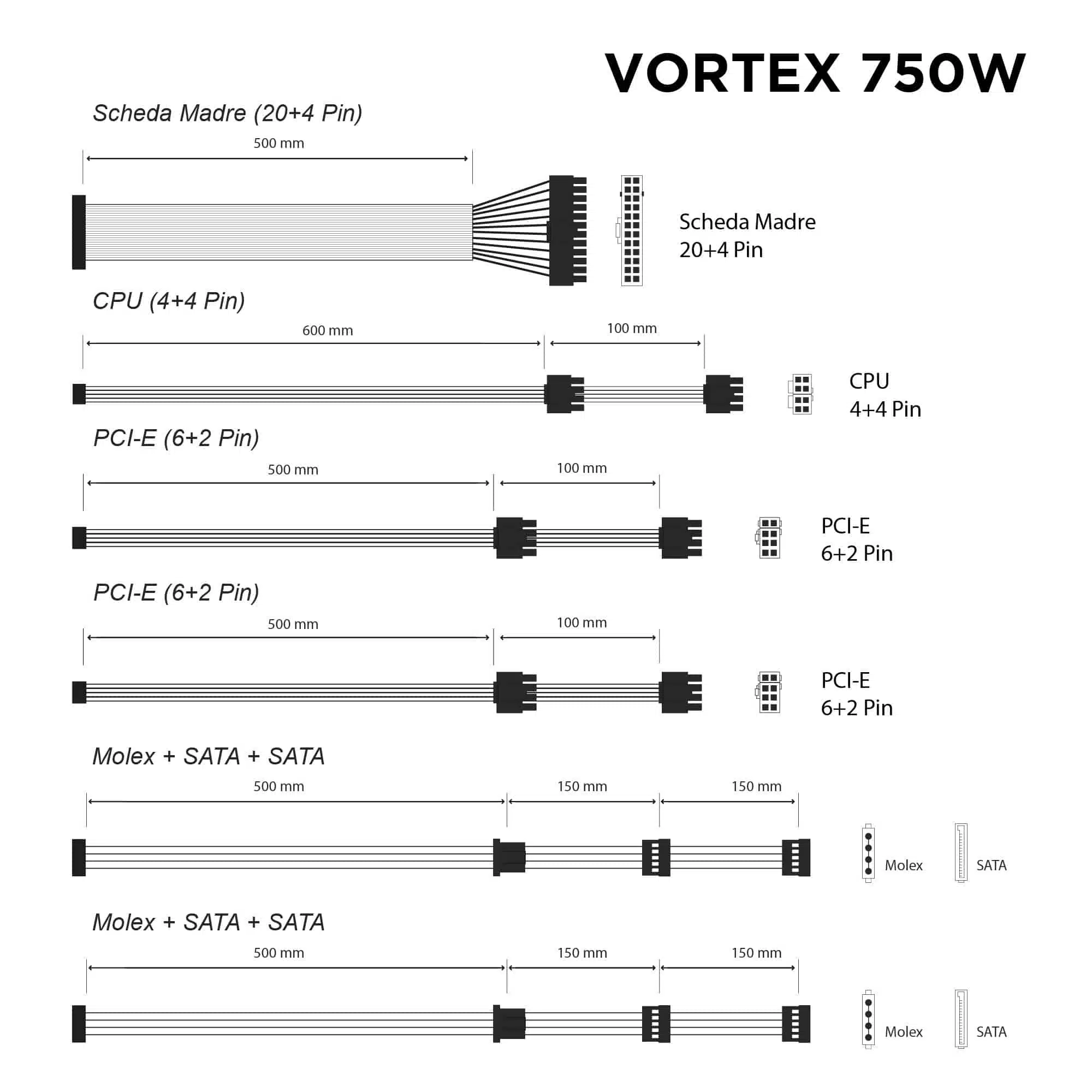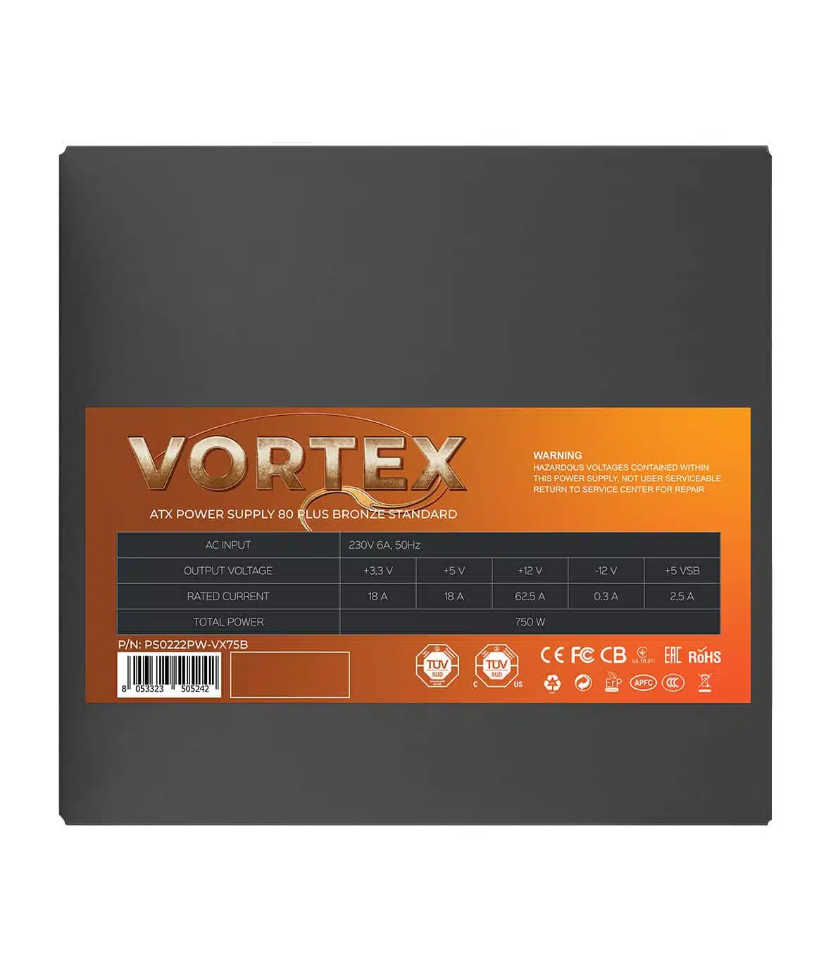 Noua Vortex 750w è un alimentatore ATX che rispetta i parametri 80+ Bronze, raggiungendo fino 85% di efficienza elettrica.